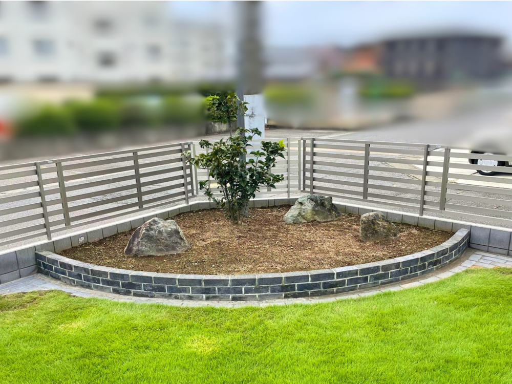 塀と天然芝の隙間にブロック、土を敷きつめ高さを揃えることにより解決です。