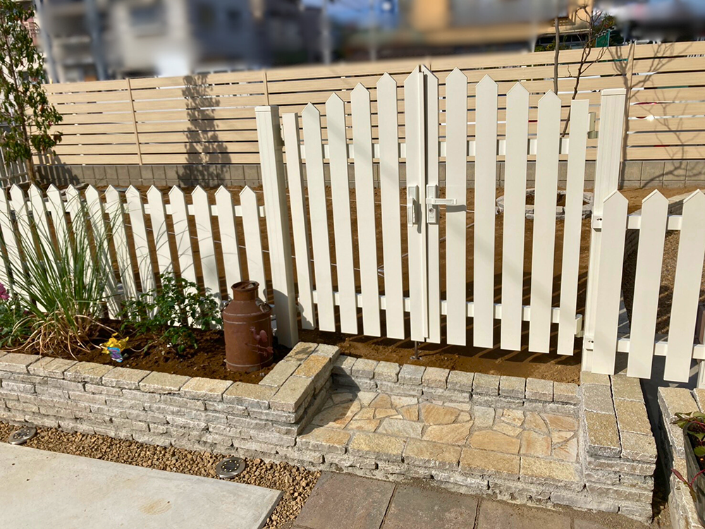 白の縦格子フェンスは芝生や庭木の緑と相性抜群です。
