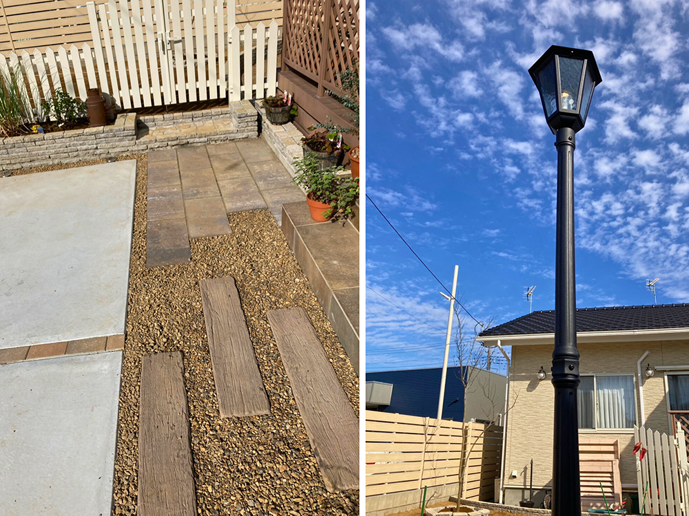 インターロッキングブロック、人工枕木などたくさんの部材を使用。