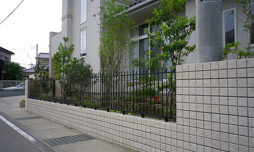 建物の外観との調和を考え砂岩系のピンコロを積んだようなイメージのブロック(日本興業さんのレクタイル)で外回りを囲いました。鋳物のフェンスはお客様が以前の家で使っていたものを再利用しました。